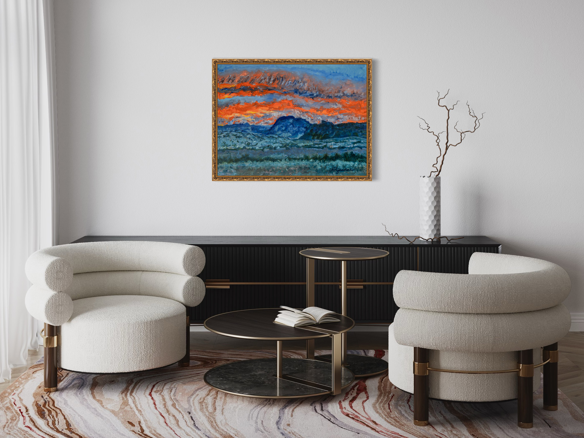 This work depicts big bend terrain moments before nightfall. What stood out to me in this scene was the contrast between the red sky and the blue mountains. I took artistic liberty in depicting the sky with bright red, angry strokes while the terrain underneath with control and abstraction in the foreground. The work expresses anger (the sky) slowly subsiding into acceptance (mountains and background terrain) and, finally, indifference (seen in the foreground).