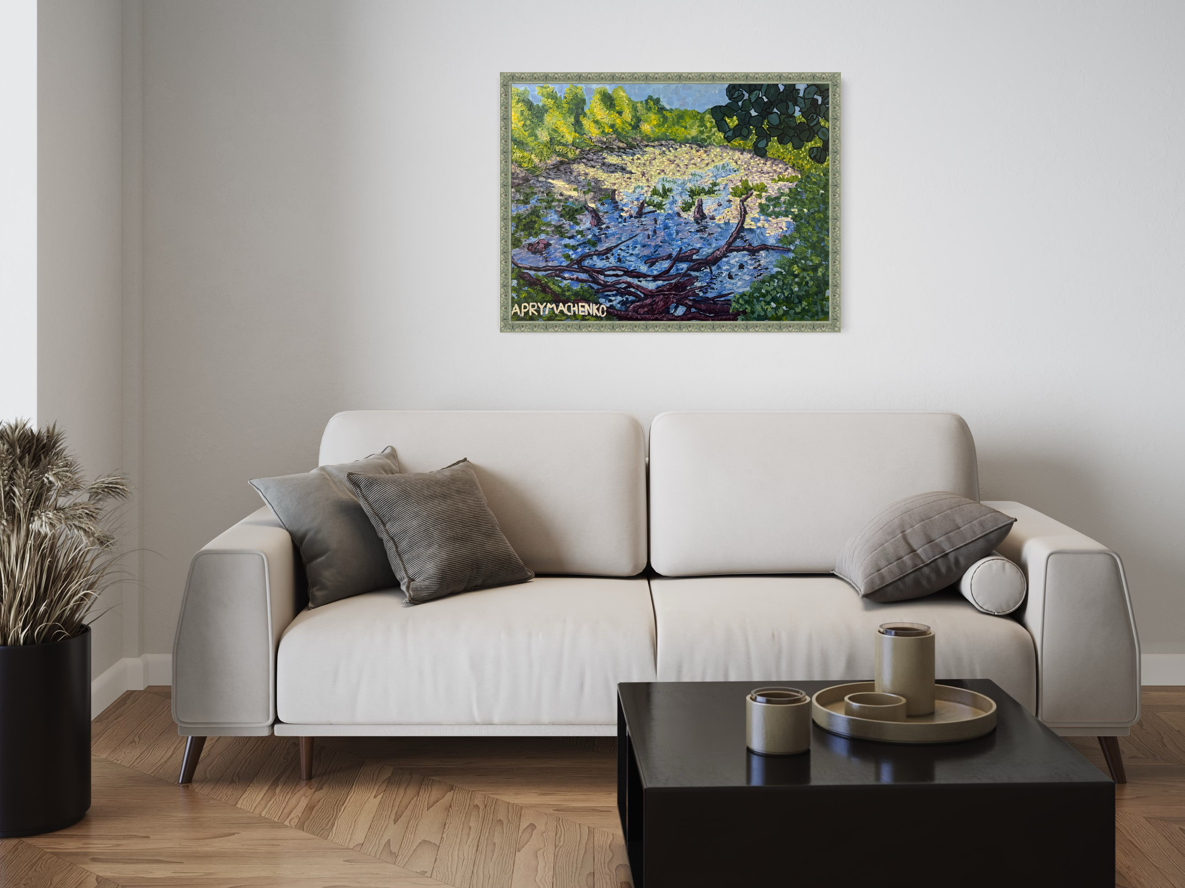 I discovered this hidden haven, just moments away from the heart of Houston. The scene captivated me due to its striking interplay between light and shadow, infused with the rawness of expressionism and the bold vibrancy of fauvism. I intensified this contrast by emphasizing the fallen branches, thereby drawing attention to the water that was gently caressed by the shadows. The scene is characterized by its thick brush strokes and a rich palette of colors. The tapestry of natural textures is painted with passion, each stroke a testament to the beauty I perceive. This painting beautifully captures the essence of a natural landscape with its vivid colors and detailed depiction of flora.