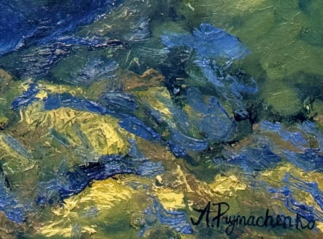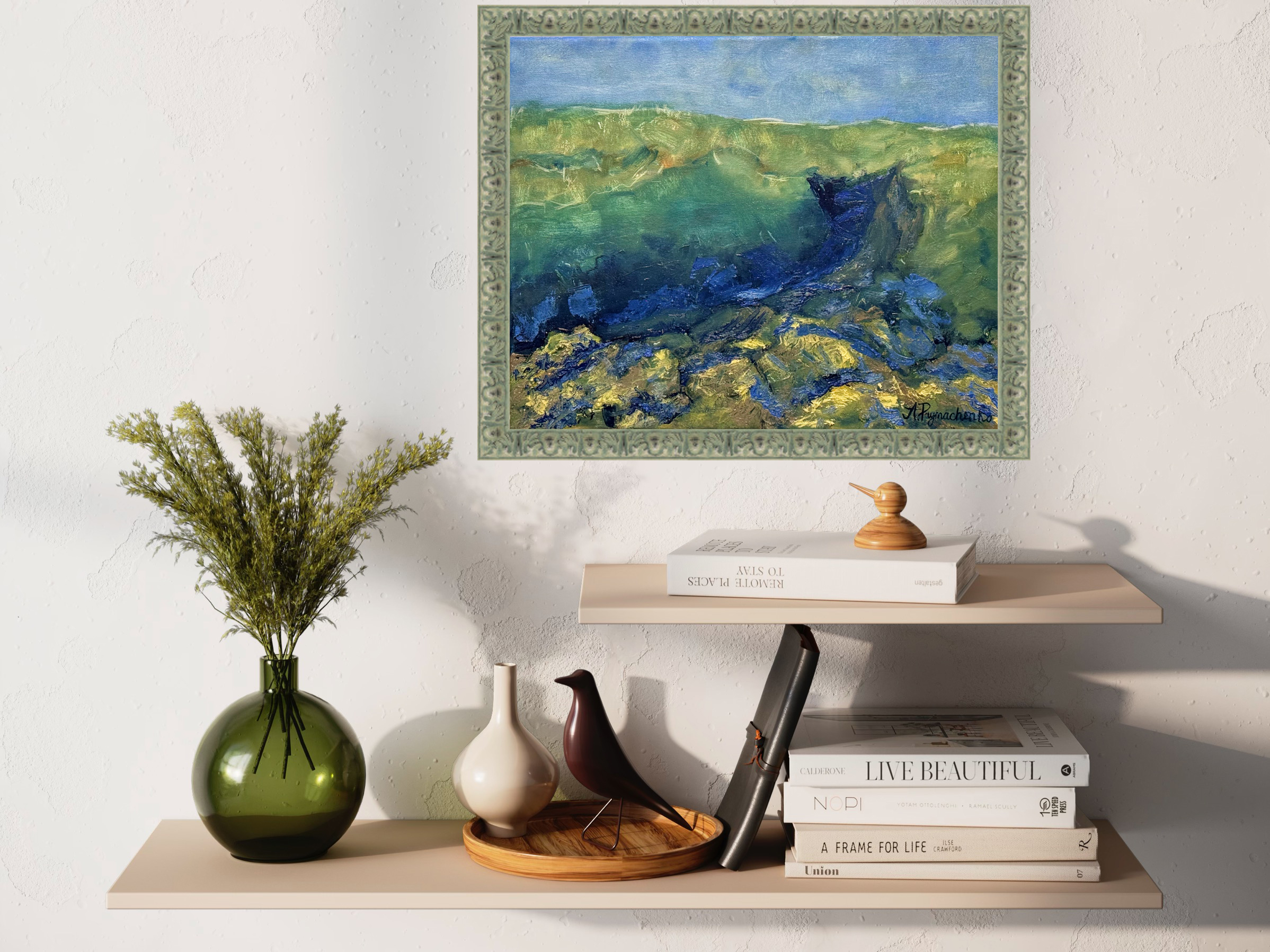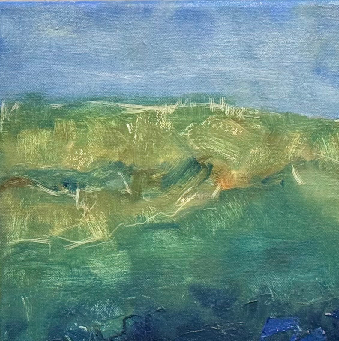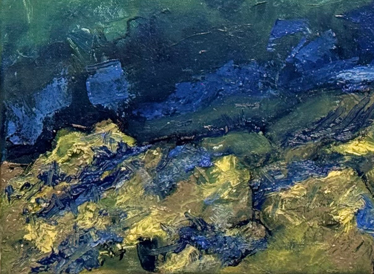This painting depicts looking down the Lake Meredith cliff into the abyss below. I utilized Sgraffito and abstraction in the background to depict a haze, the world falling away. Impasto, Sgraffito, and yellow was used to bring attention to the rugged edge of the cliff.