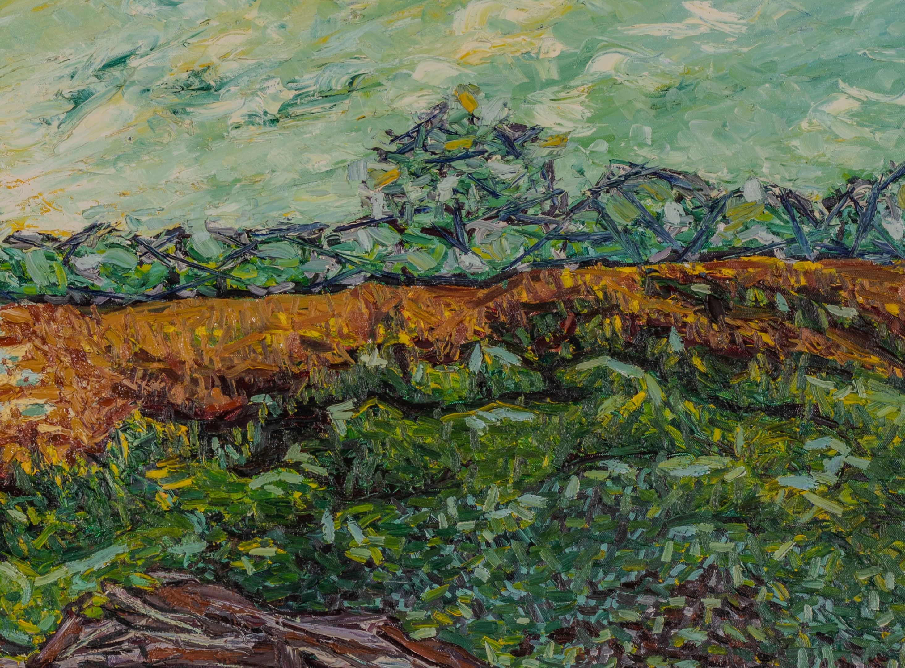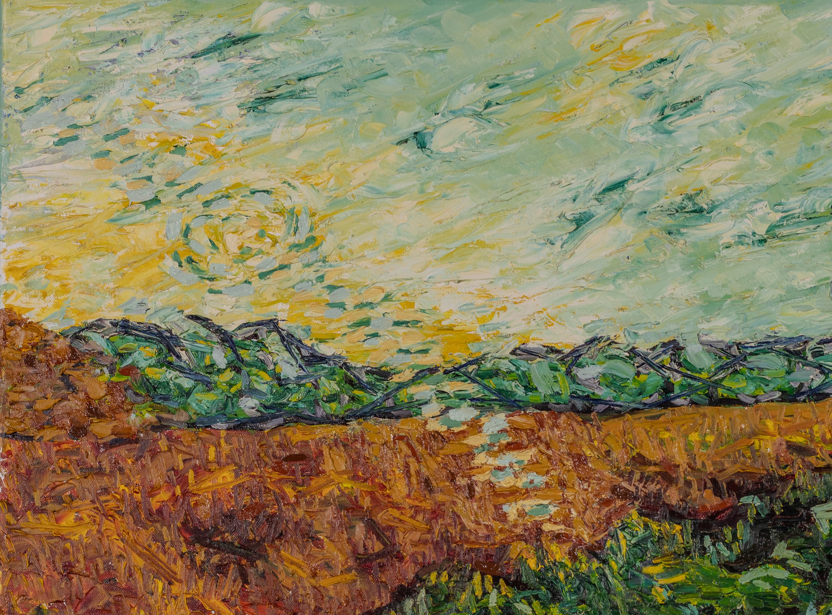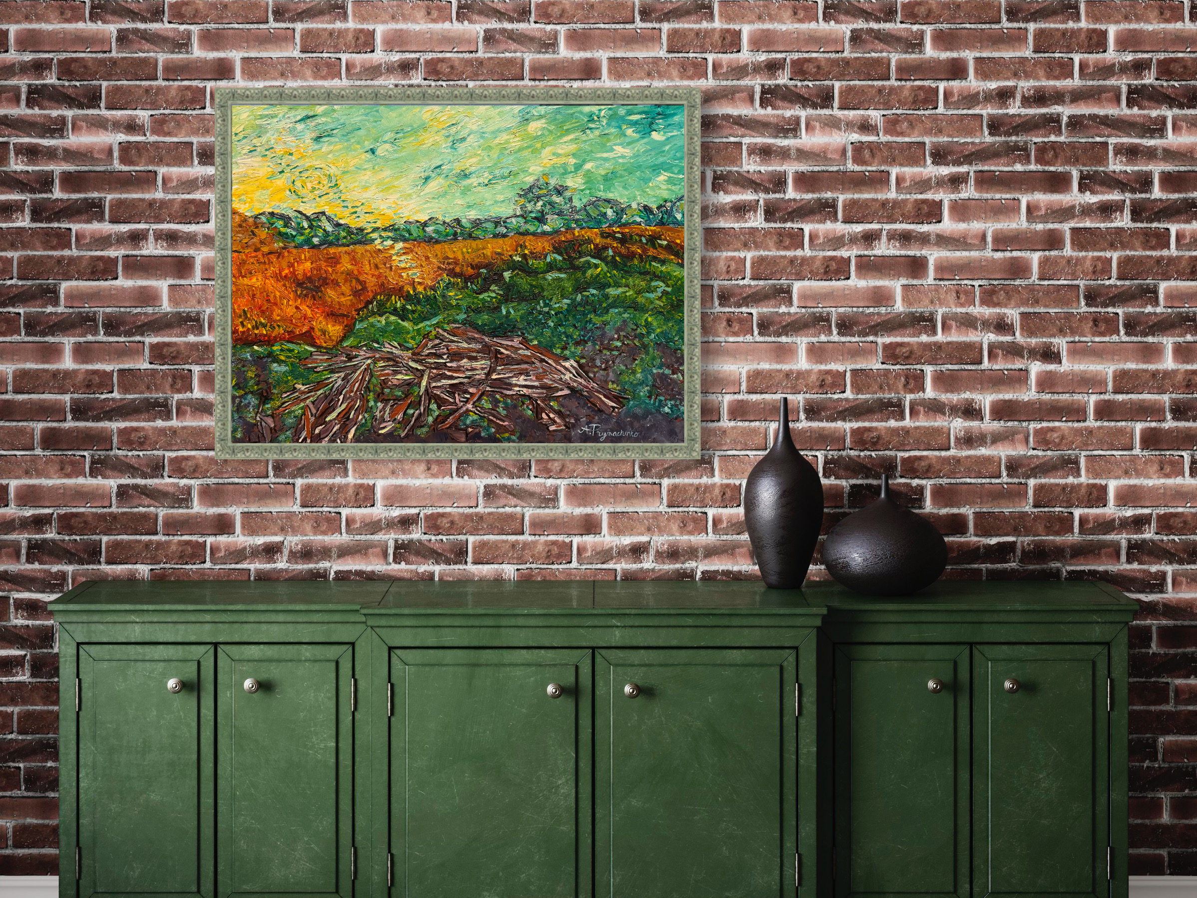 In this oil painting, I wanted to capture the interplay of shadows and light, using vivid, textured brushstrokes to breathe life into the canvas. This artwork, inspired by a simple "stroll in the park," captivates with its vibrant interplay of red and green hues, forming the core of this piece. The extraordinary kaleidoscopic fusion of colors, unlike anything I've observed in nature before, compelled me to immortalize it. The painting's drama is heightened by the radiant path of light that cuts through the grass, the meticulously outlined fallen branches scattered around, and the geometrically silhouetted trees in the backdrop. This piece is a testament to the extraordinary beauty that can be found in ordinary moments.