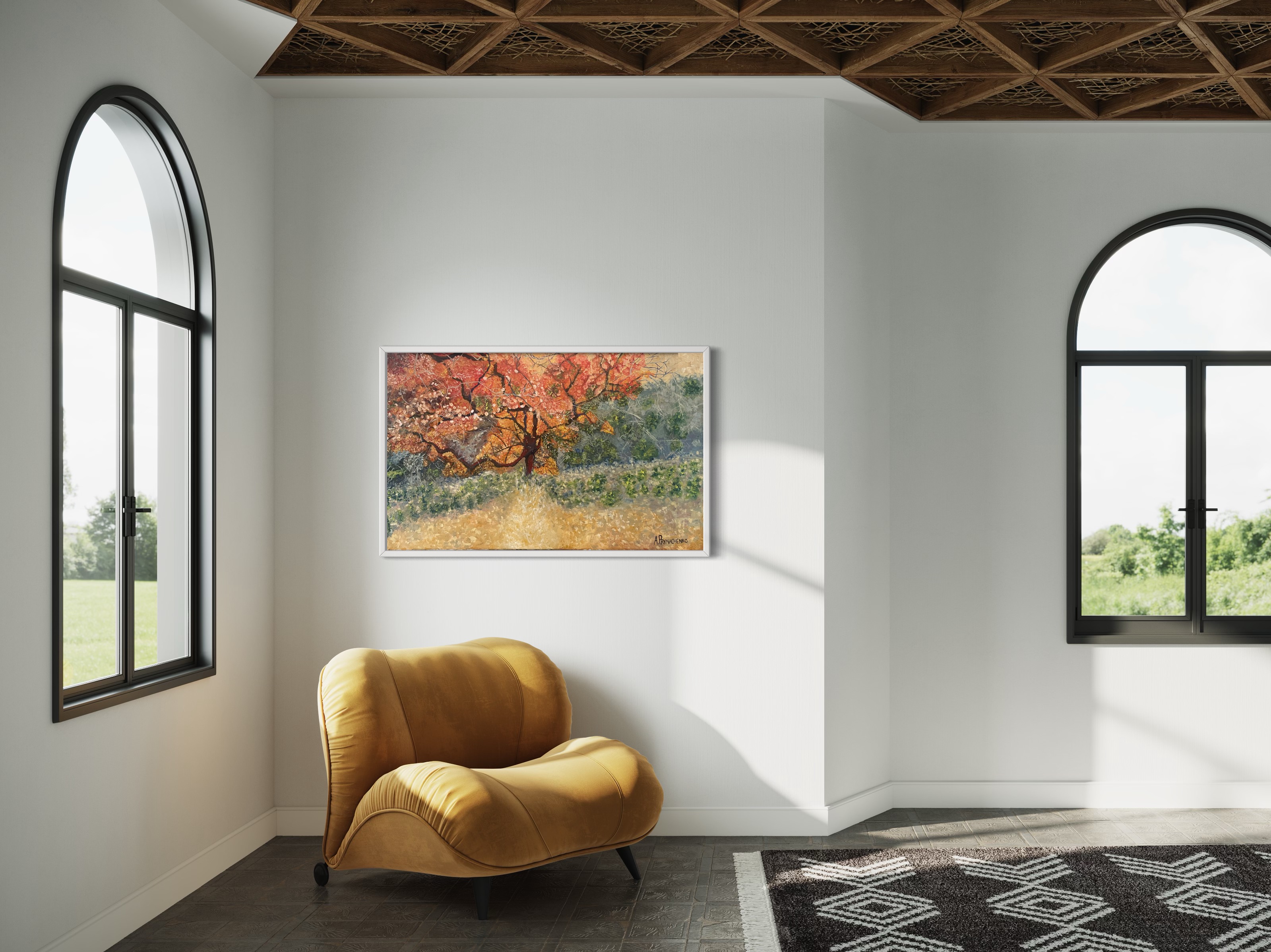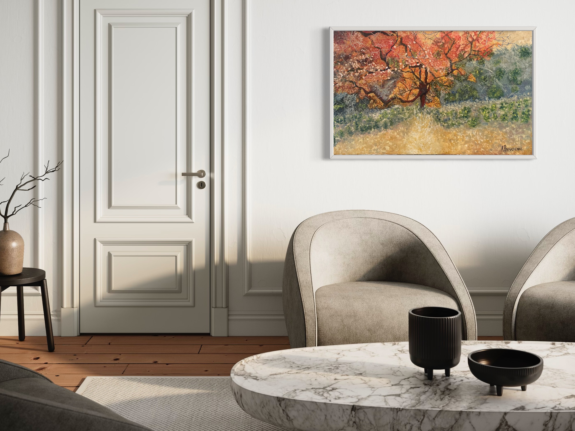 While hiking in the Lost Maples State Park, Anastasia came across this landscape and immediately knew that it will be the subject of her debut painting. This tree had the appearance of burning, especially when juxtapositioned against the greenery. This painting was created in May 2022, during a very upsetting time for the artist: Roe vs. Wade was on the verge of being overturned, Environmental Scientists were protesting the lack of action from the government, and Wynn Bruce even set himself on fire due to lack of attention from the media and the public on the environmental protests. Anastasia wanted to capture her anger and frustration over the powerlessness of this period. This painting is a critique of our society: the viewer can't help but admire the beauty of the painting, while the main object is imploding.