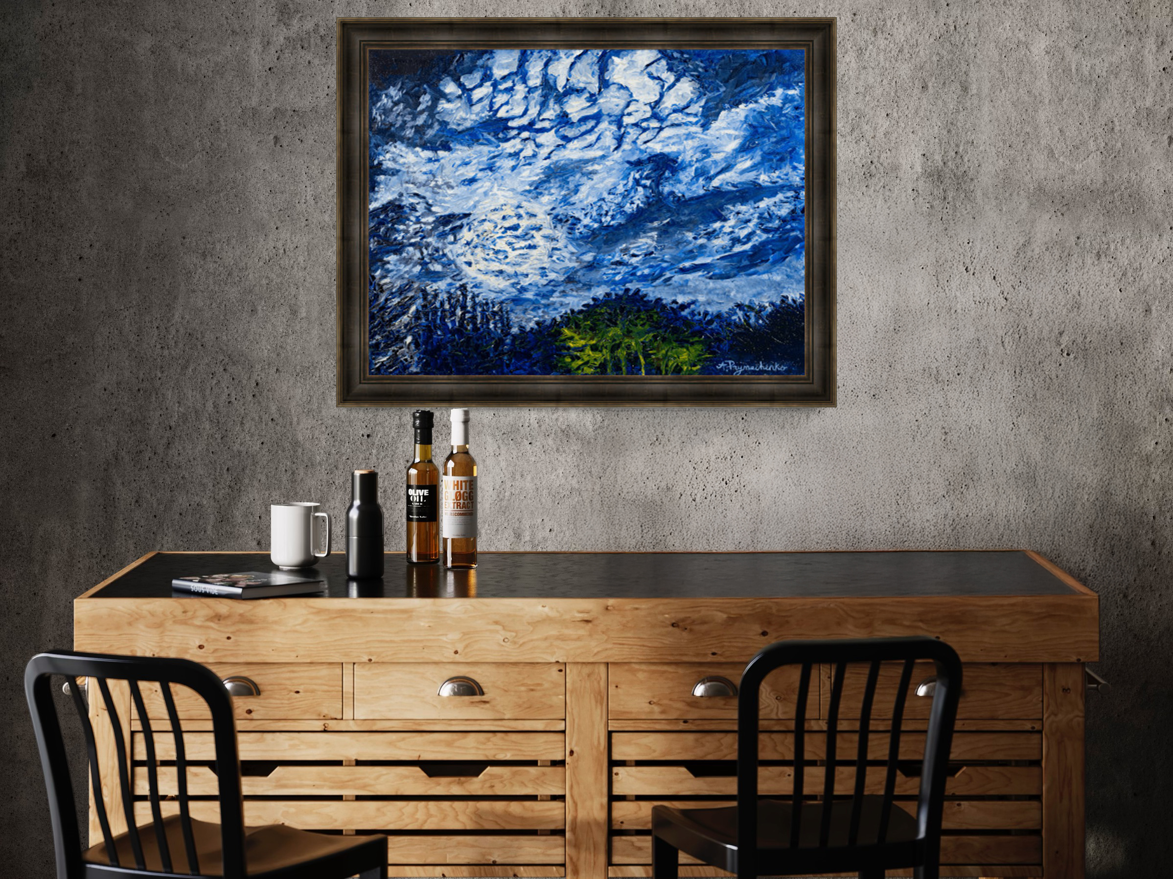 In this emotive oil painting, I sought to capture the dramatic lunar cloudscape that was a hallmark of the Summer of 2023, a period distinguished by a series of super-moons. The artwork presents a nocturnal scene, where a radiant full moon takes center stage, its light bathing the thick, textured clouds and creating an ethereal atmosphere. Despite the stormy clouds, the moon's intense and luminous presence gives the impression of being almost within grasp, a detail that is particularly striking. The landscape beneath is shrouded in darkness, with only faint traces of greenery. The moonlight is exquisitely depicted, casting a tranquil and mystical aura over the scene. This painting captures the profound and stirring interplay of darkness and light, where brushstrokes converge and dance, evoking the silent intensity of the night. The dramatic, luminous sky against the tranquil, enigmatic land creates a magnetic tension. In essence, the painting masterfully juxtaposes the luminous moon against the dark surroundings, crafting a mesmerizing lunar landscape.