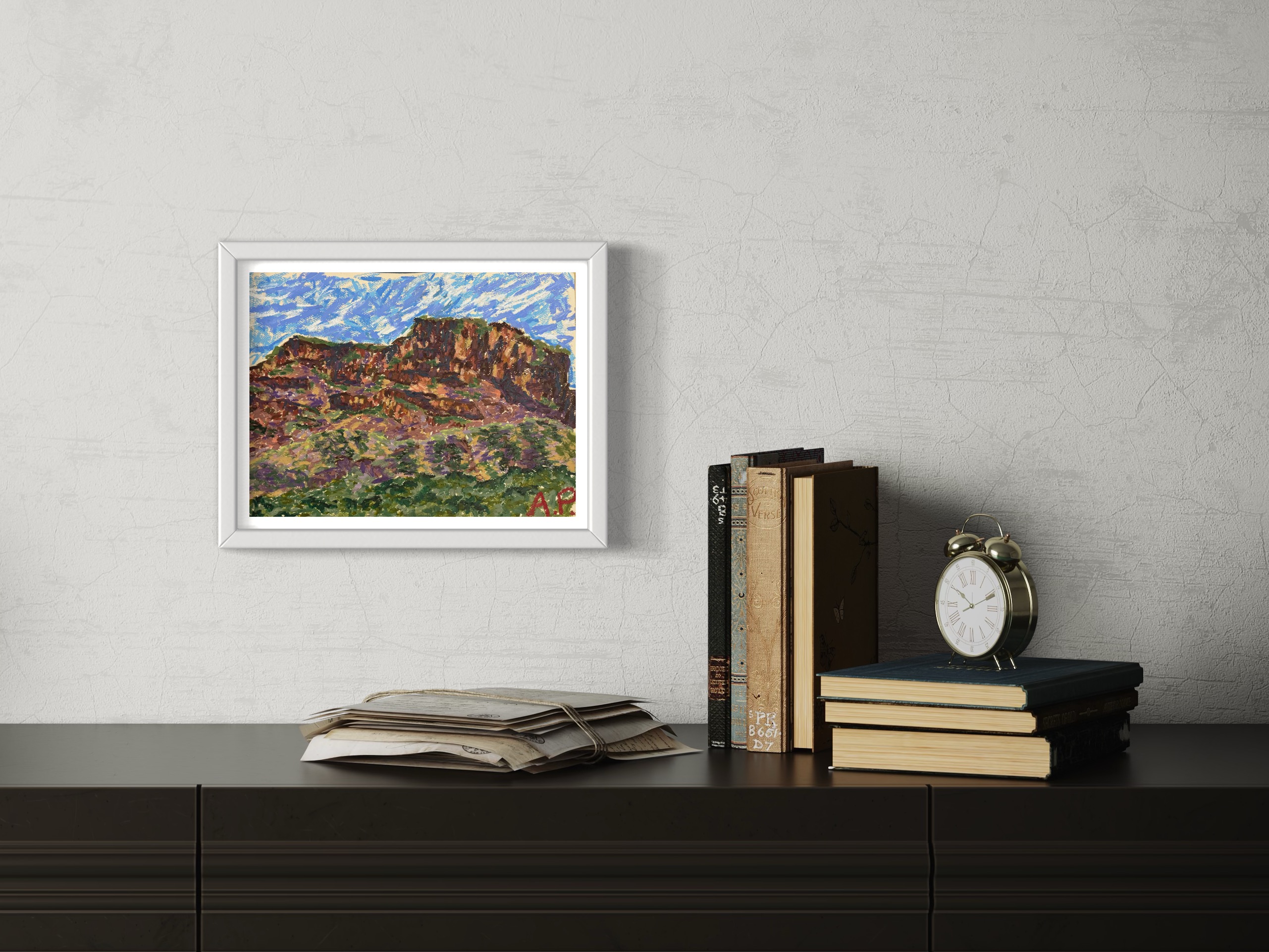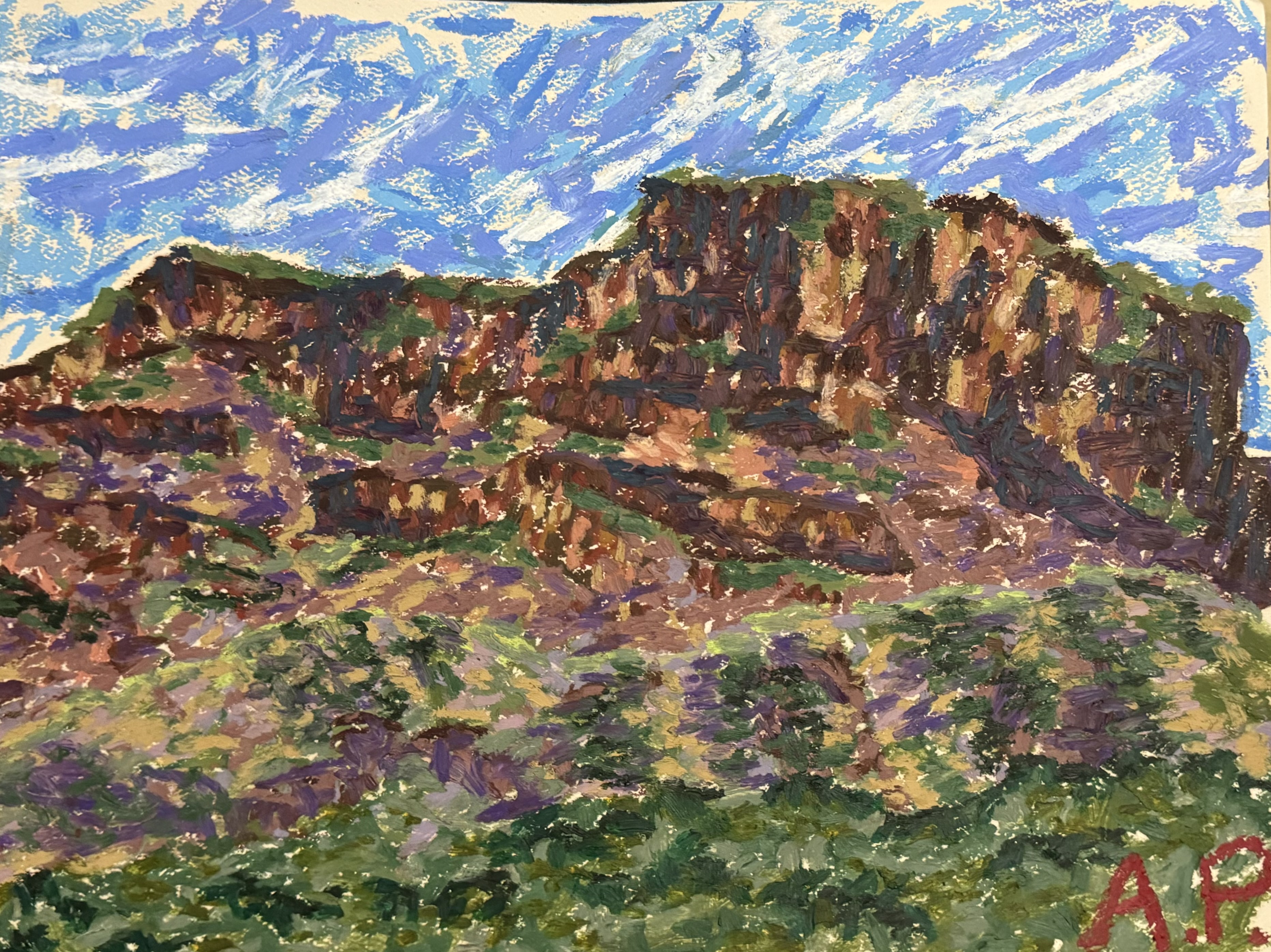 In "Rustic Sierra Mesa," I aimed to capture the raw beauty of this desert landscape. The rugged cliffs stand boldly against the expansive canvas, drawing the viewer's eye along their diagonal lines-from the foreground to the distant mountains. The warm oranges, deep reds, and earthy browns evoke the intense sunlight and arid environment of Big Bend, while the cool blues and purples in the distant peaks provide a pleasing contrast. Using oil pastels, I layered rich, textured strokes to convey the rough texture of the cliffs and the softness of the sky. Bold strokes and expressive lines capture the ruggedness of the landscape, allowing the viewer to immerse themselves in the untamed beauty of Big Bend.