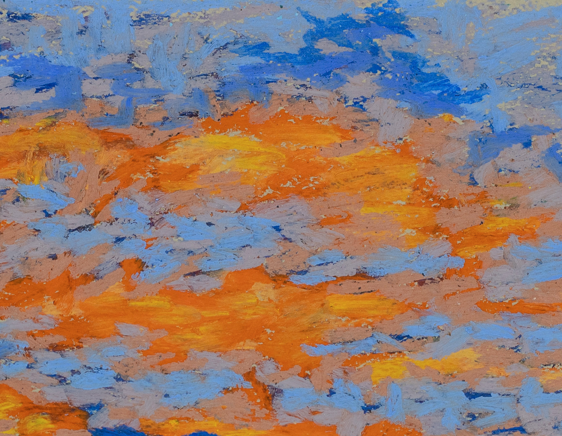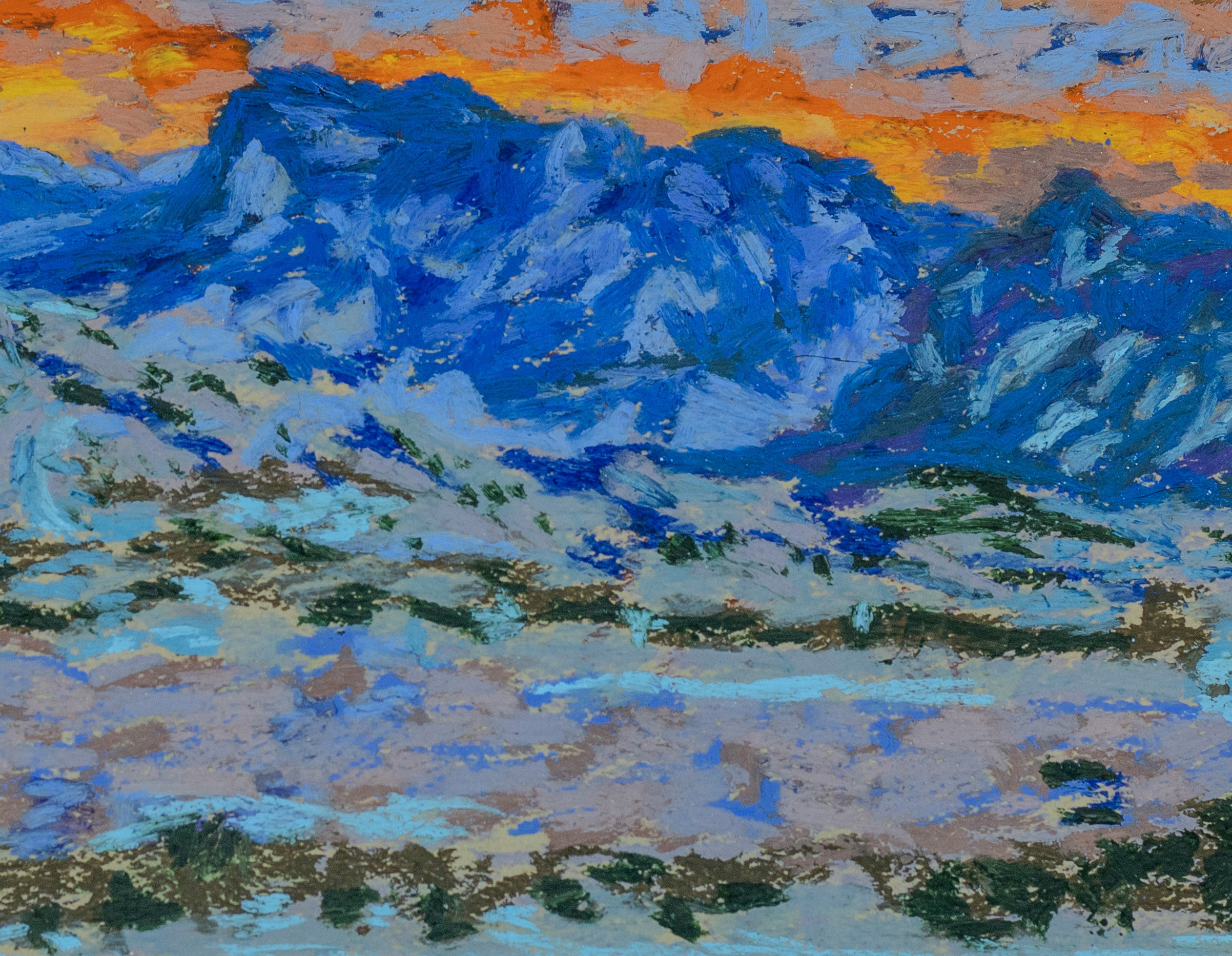In "Saffron Sunset over Chisos Terrain", I aimed to capture the raw beauty and energy of the desert landscape. The bold diagonal lines of the rugged cliffs create a dynamic movement, drawing the viewer's eye from the foreground to the distant mountains. Vibrant oranges, deep reds, and earthy browns dominate the scene, echoing the intense sunlight and arid environment of Big Bend. The expansive sky above adds a sense of vastness, emphasizing the scale of this majestic terrain. The cool blues and purples in the distant peaks provide a striking contrast, suggesting the interplay of light and shadow.
