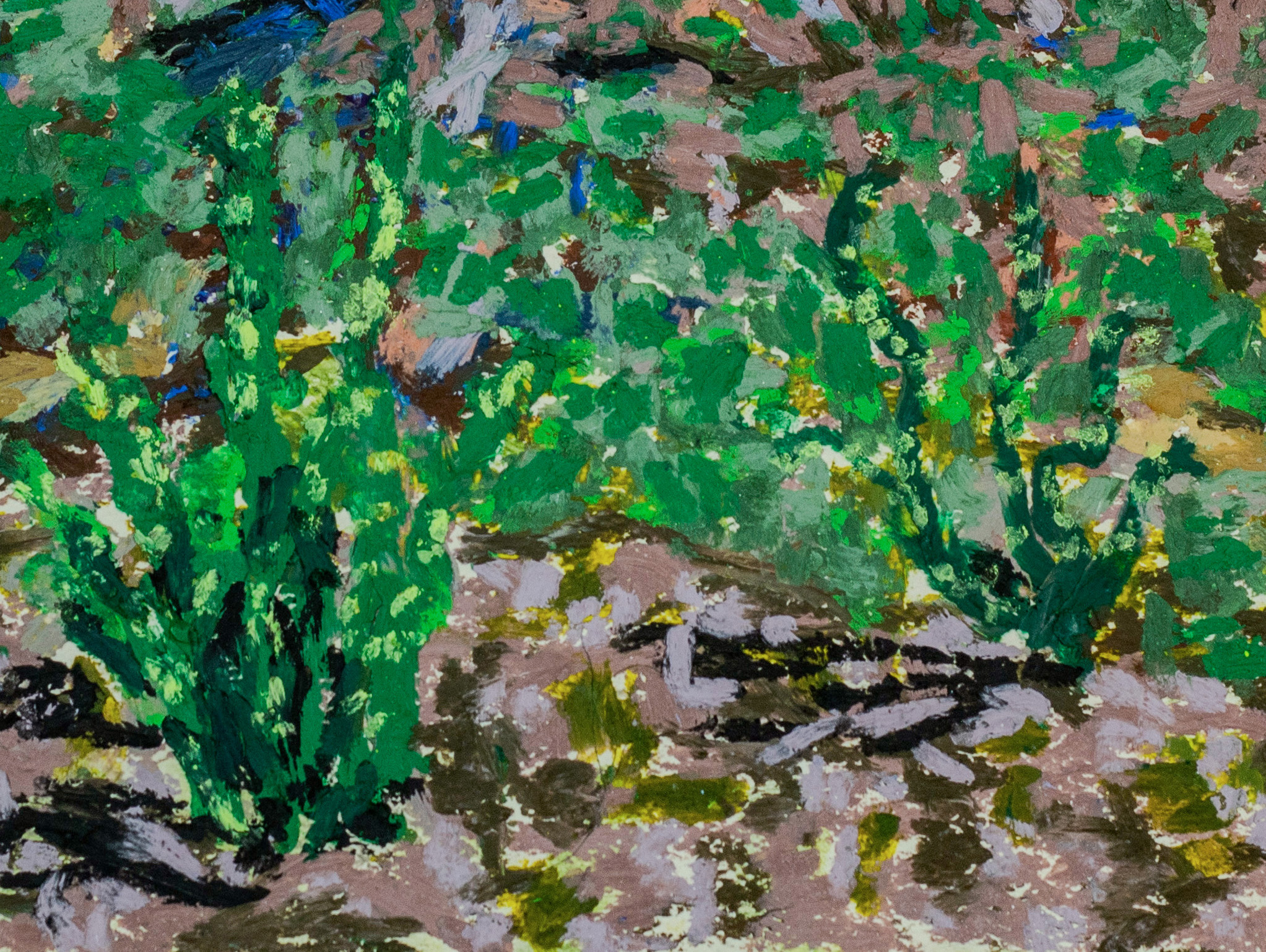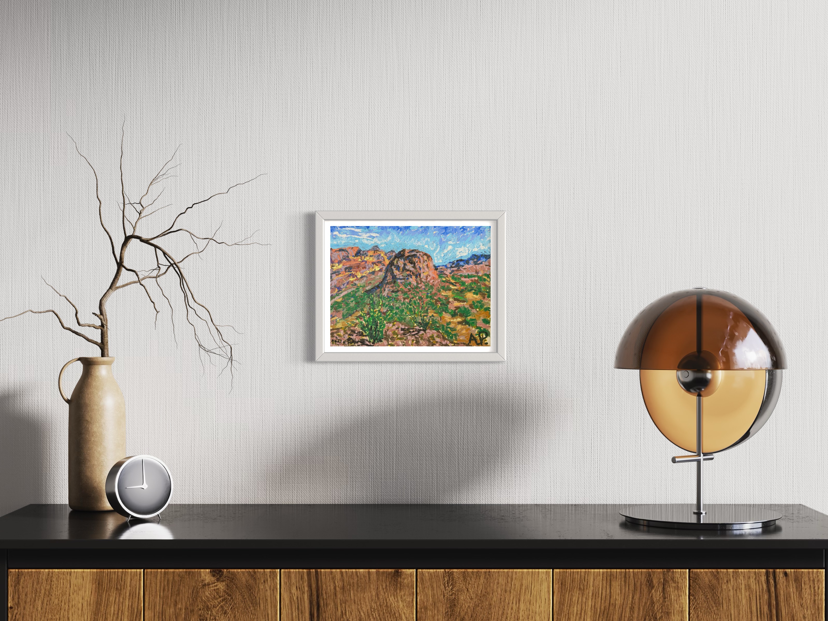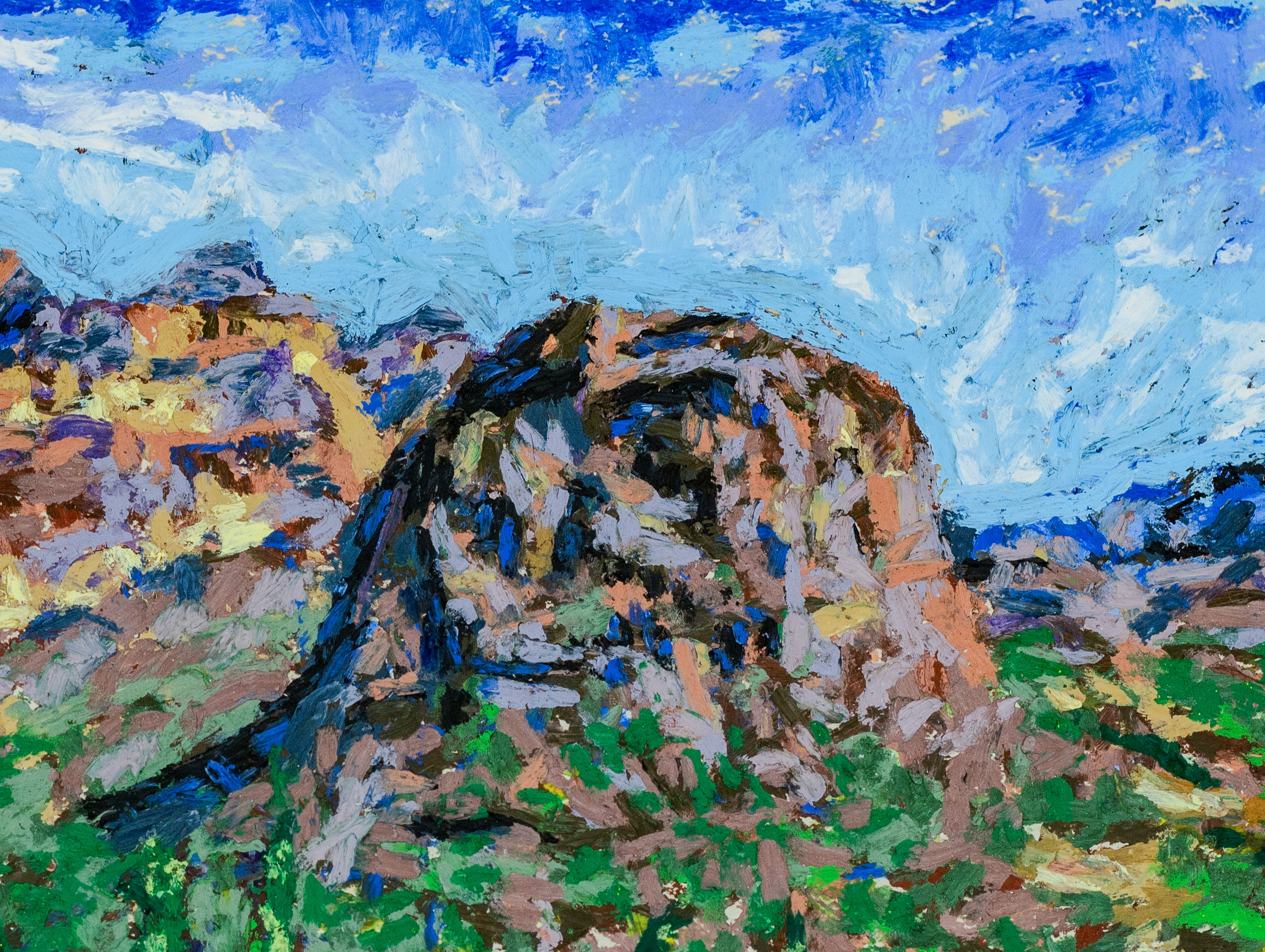 The composition of "Dome Amidst Rugged Terrain" is dynamic, with the rocky terrain dominating the lower half and the swirling sky taking up the upper portion. The diagonal lines of the cliffs lead the viewer's eye upward, creating a sense of movement and energy. Warm earth tones-rusty reds, burnt oranges, and sandy yellows-define the rugged landscape. These colors evoke the sun-baked desert. The cool blues and purples in the sky provide a striking contrast. They hint at the approaching twilight or the promise of rain.