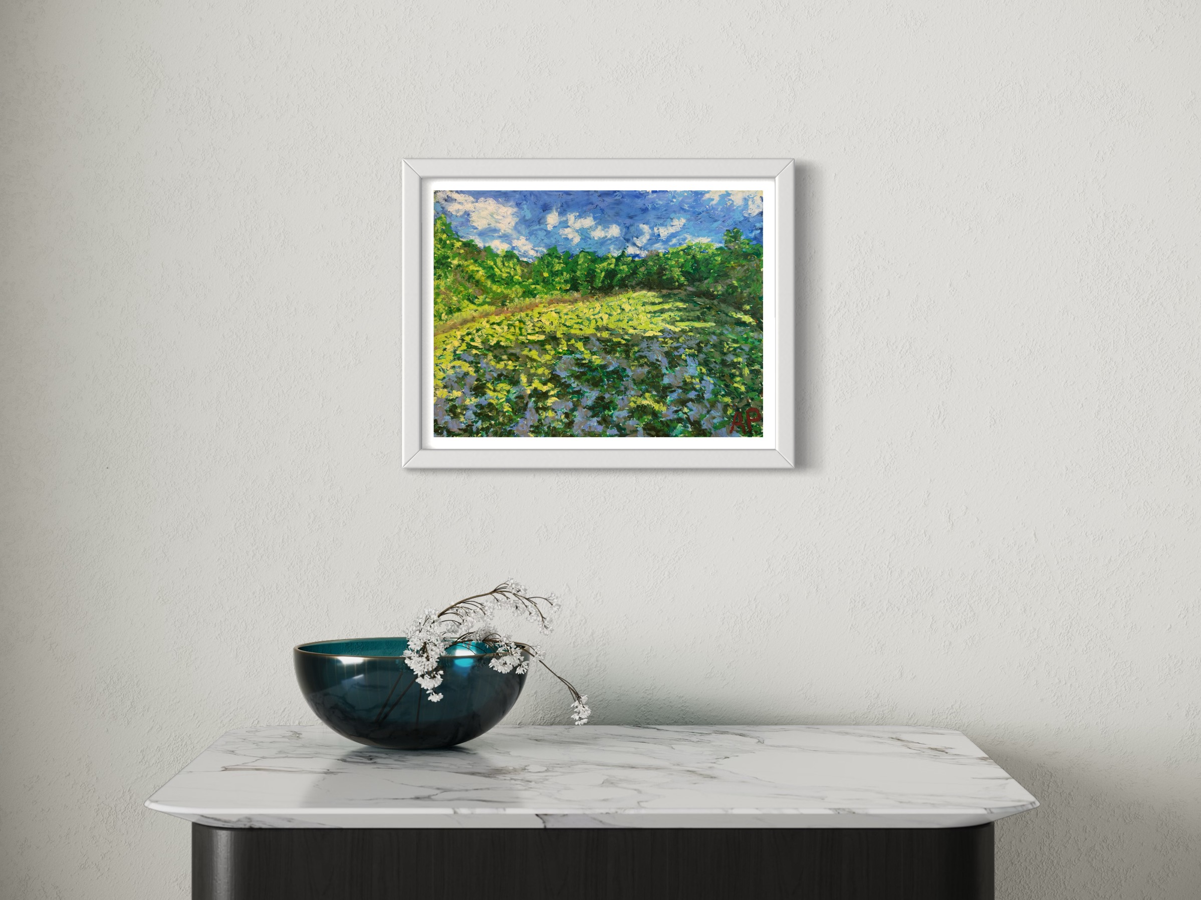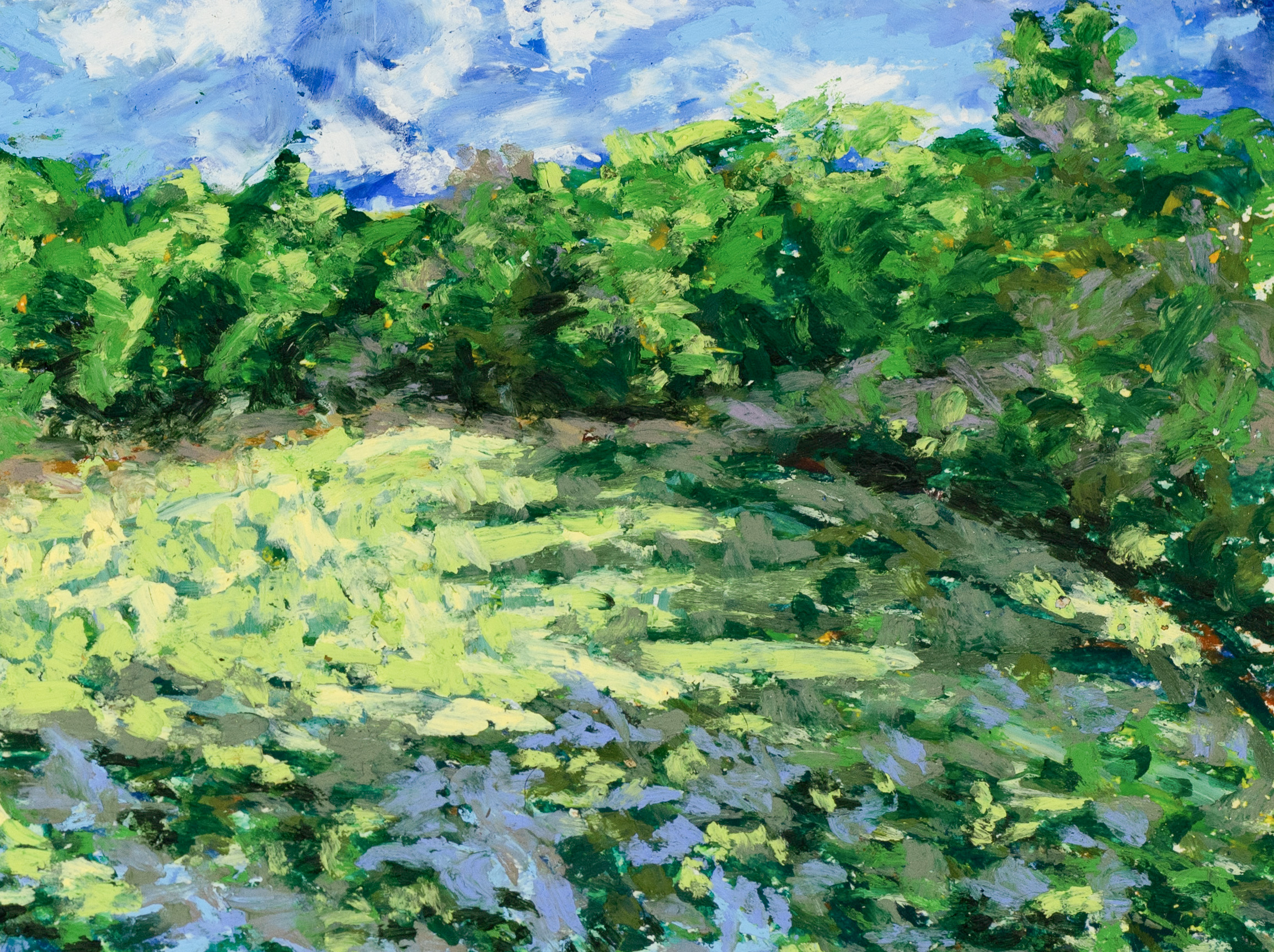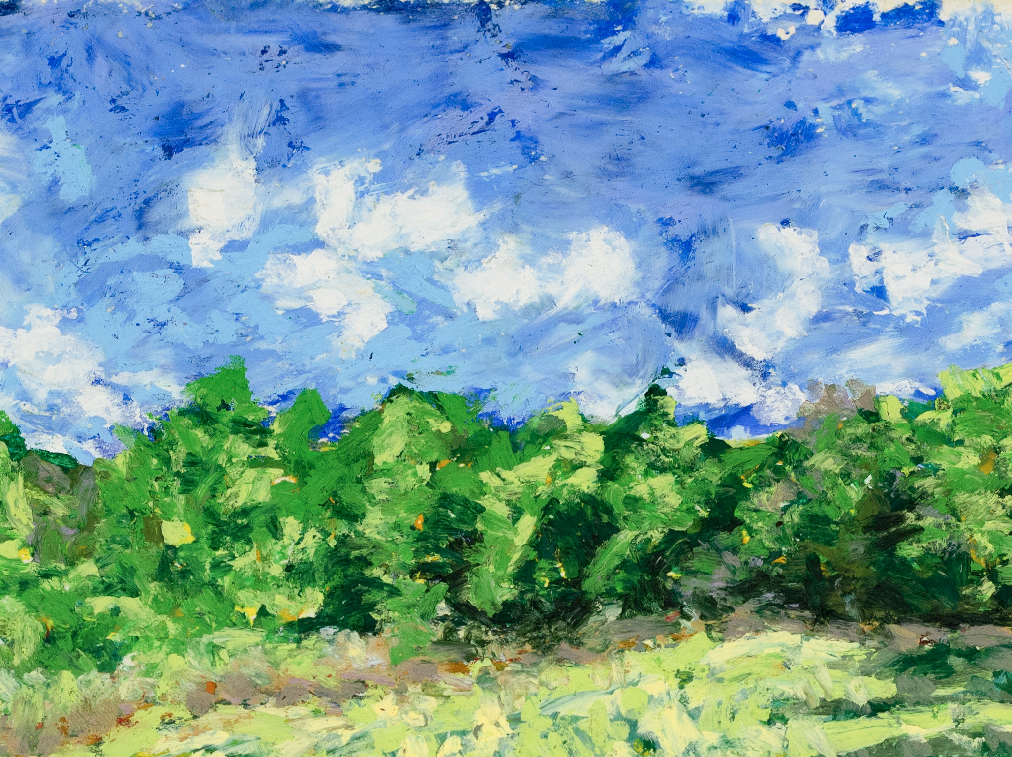 The "Sunbeams over Sheldon Marsh," oil pastel drawing captures the dynamic interplay of natural light with the lush greenery of the landscape. The sky, painted with soft yet vivid hues of blue and white clouds, reflects the tranquility of the scene. It is a testament to the beauty of nature and the power of art to evoke emotion and provoke thought. It represents my continuous exploration and experimentation with color, light, and texture to capture the essence of the natural world.