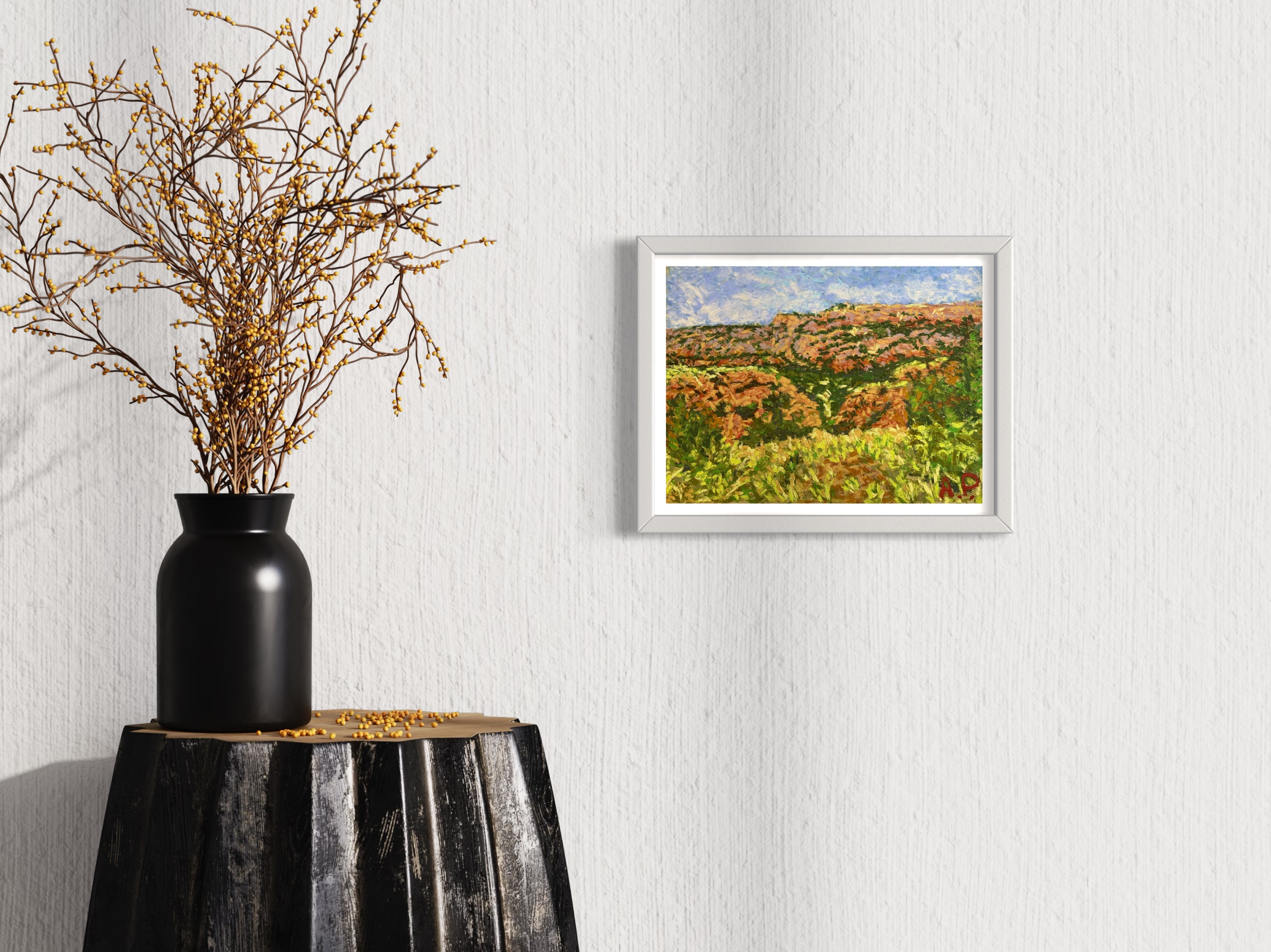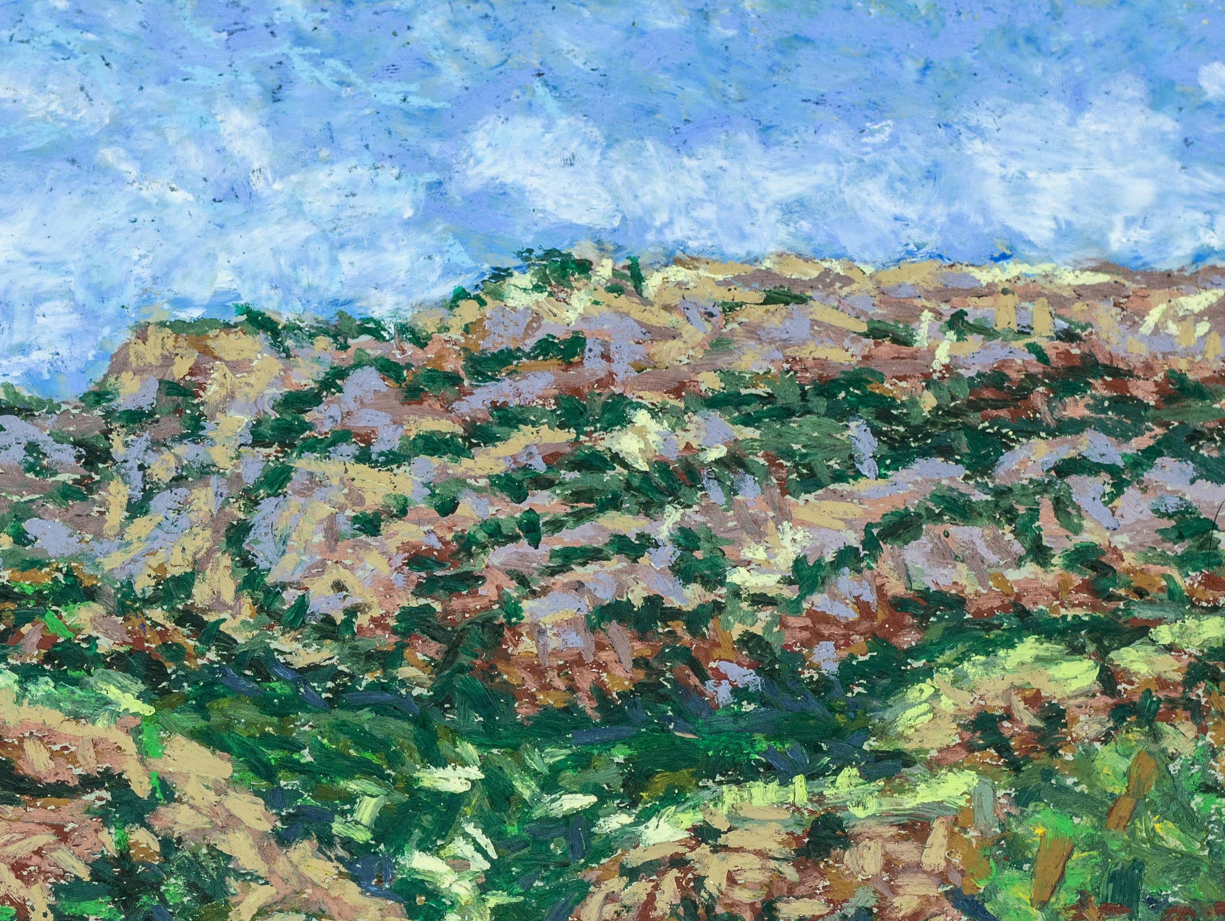 In "Terrain over Palo Duro Canyon," the landscape is not just a depiction of rolling hills and lush vegetation, but a manifestation of my inner world. The rich palette brings the landscape to life, creating a sense of depth and dimension. The blues and whites in the sky suggest tranquility, while the varied greens of the vegetation convey the dynamic interplay of nature's elements. The expressiveness of the piece adds energy and movement to the scene.